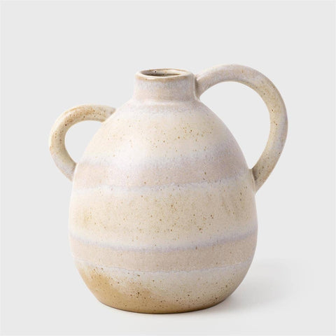 The vase features a unique reactive glaze finish, creating a one-of-a-kind color and texture on each piece. The pottery design and farmhouse-inspired style give it a rustic charm that adds warmth and elegance to any space. The handle adds a touch of functionality and aesthetic appeal.  This vase is perfect for a variety of settings, including living rooms, dining rooms, bedrooms, and office spaces. It can be used to hold fresh or dried flowers.